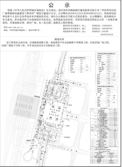 昨天,阜阳市规划局公布了阜阳高铁西站站前广场等基础设施建设工程项目的规划方案公示!此次规划的内容包括:道路工程,站前地下广场和空间,汽车客运西站,下穿隧道工程以及公交枢纽工程! 其中有一项最